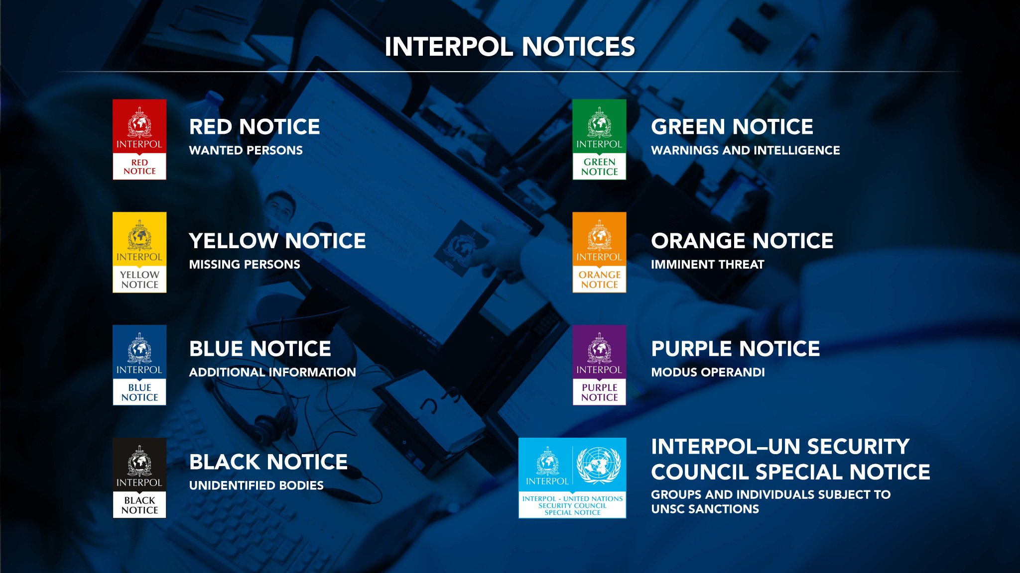 It is one of seven distinct color alerts that Interpol is able to send out. These include Yellow Notices, which try to find missing people, and Blue Notices, which look for information about a person’s identity or link to a crime. Nonetheless, INTERPOL issues Red Notices far more frequently than any other kind of notice.